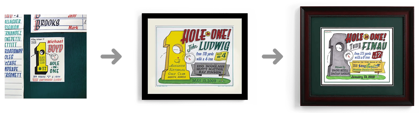 The evolution of my Hole-in-One Artwork, from the quick signage on an actual scoreboard to the refined commemoration I offer today